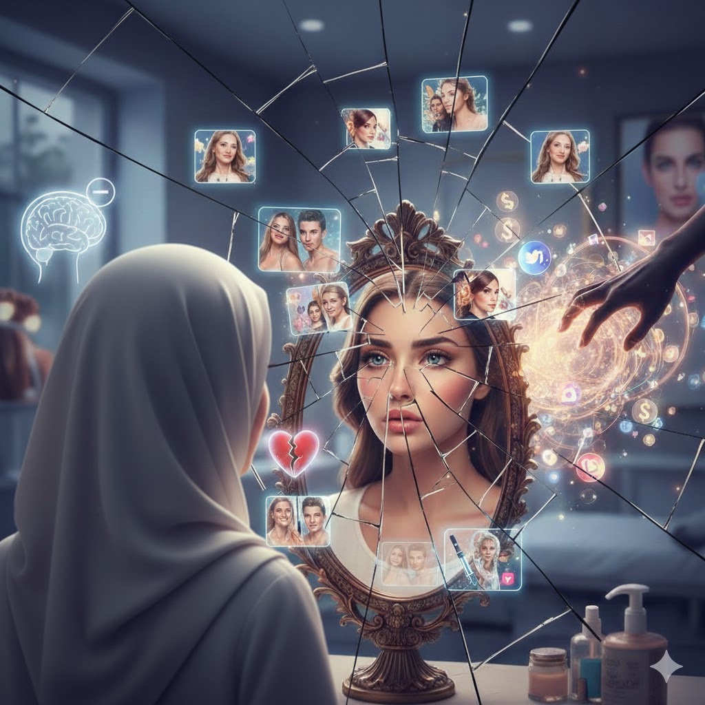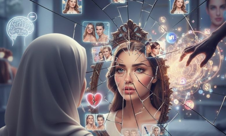 3. تضخم وسائل التواصل الاجتماعي والثقافة الاستهلاكية المعايير الجمالية غير الواقعية وتزيد من المقارنات الاجتماعية.